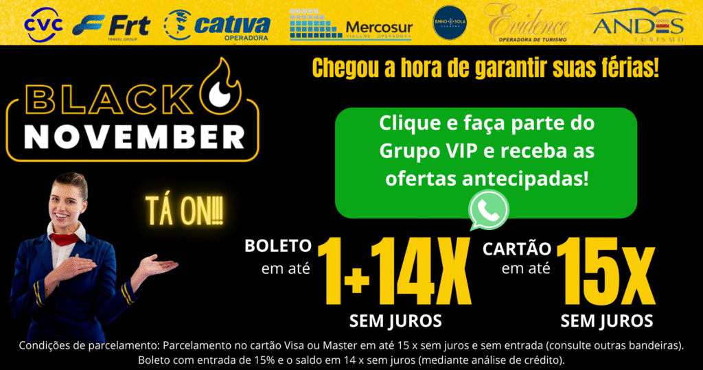 Entre para o grupo VIP da Annaí Turismo no WhatsApp e receba com exclusividade promoções secretas, descontos de Black November e condições especiais de parcelamento.